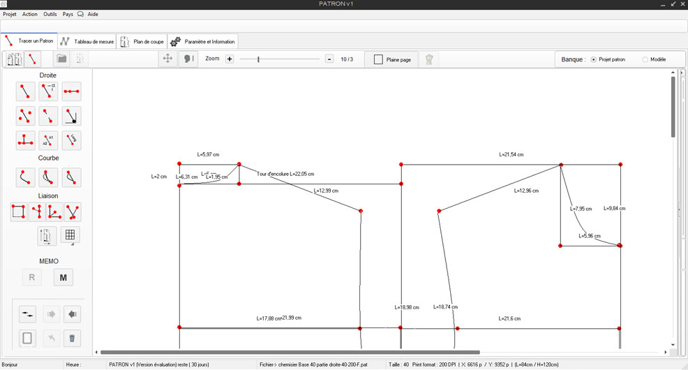 PATRON_v1 est un logiciel destiné à créer des patrons de deux façons différentes, par tracé à plat ou par recopie d’un dessin scanné au format A4 utilisé comme calque puis redimensionné en fonction de l’échelle du tracé du dessin.