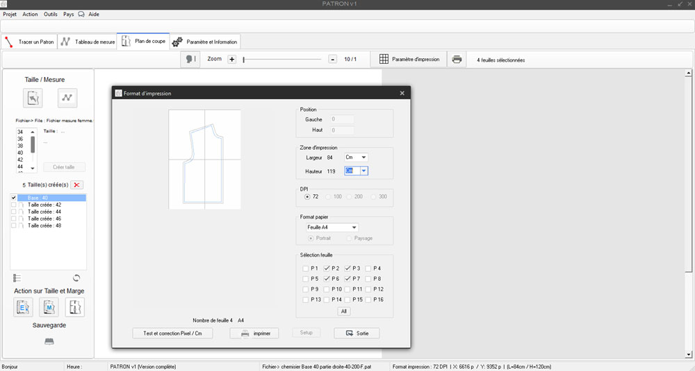 Résultat obenu après sélection de la taille 40 avec une marge de couture de 1 cm et désélection des feuilles inutiles.