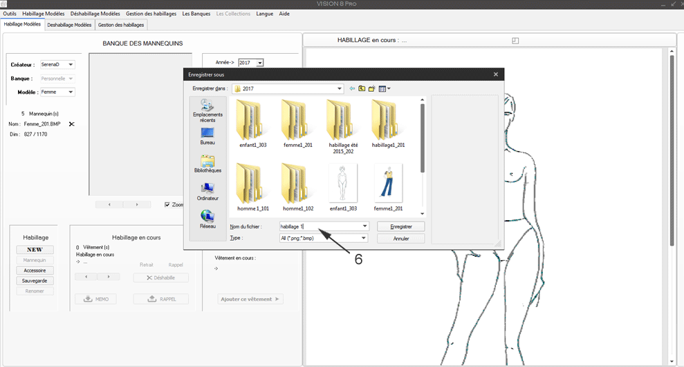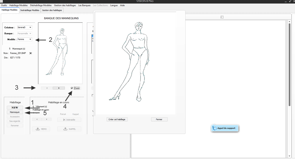 En (5) une fois la sélection faite (ici un mannequin Femme) on clique sur Mannequin pour le sélectionner avant l'enregistrement initial de l'habillage en cours de création.