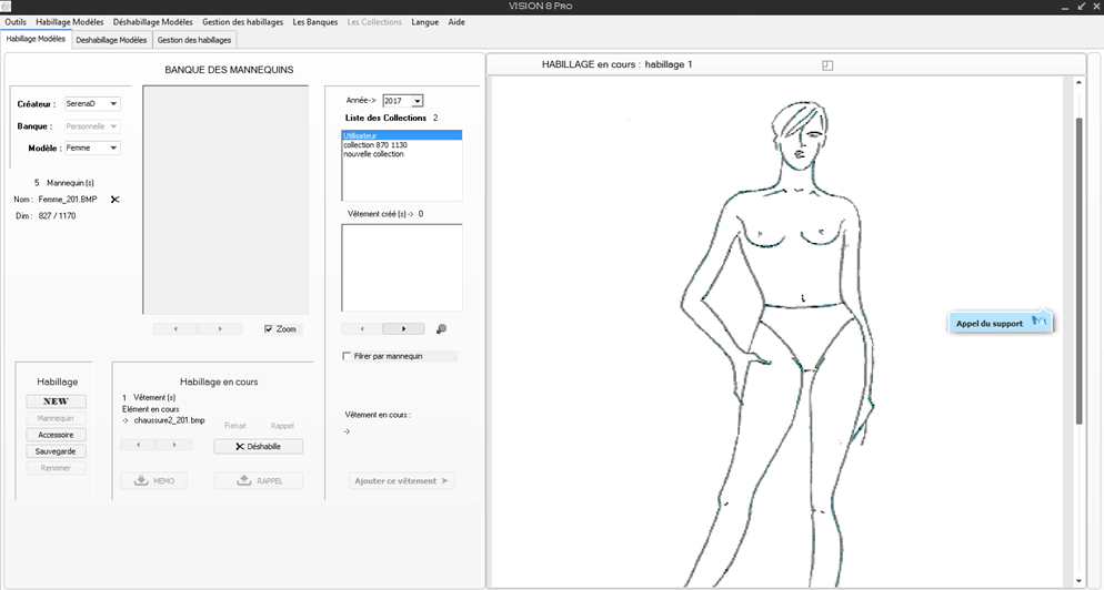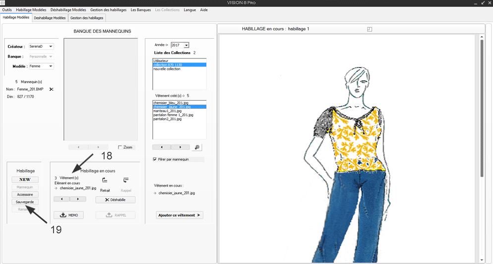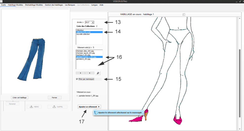 En (13) on sélectionne l'année de la collection ou l'on a créé les vêtements que nous souhaitons utiliser pour cet habillage (ici 2017)