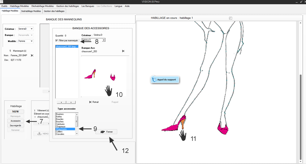 En (8) nous filtrons la liste des accessoires créés au regard du mannequin en cours, cela accélère la recherche des accessoires créés avec ce mannequin.