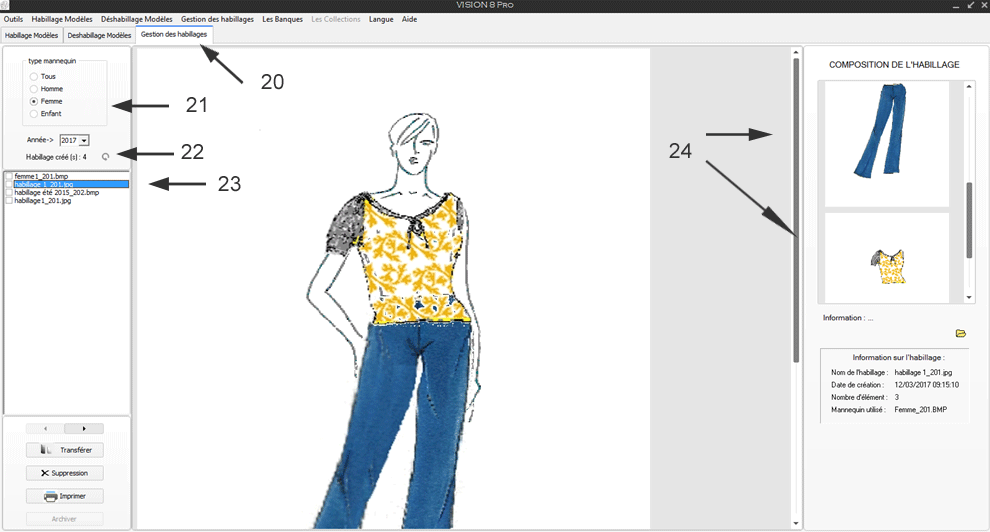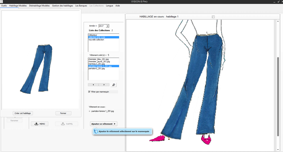 En (15) nous filtrons les vêtements créés avec ce mannequin ce qui accélère la recherche des vêtements utilisables avec ce mannequin (ici 5 vêtements trouvés).