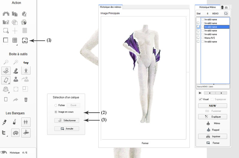 En (1) il est possible de masquer le mannequin ou de le rappeler au choix.