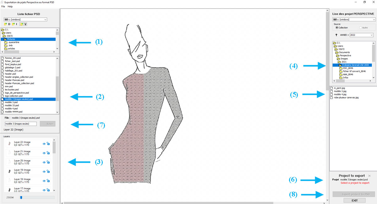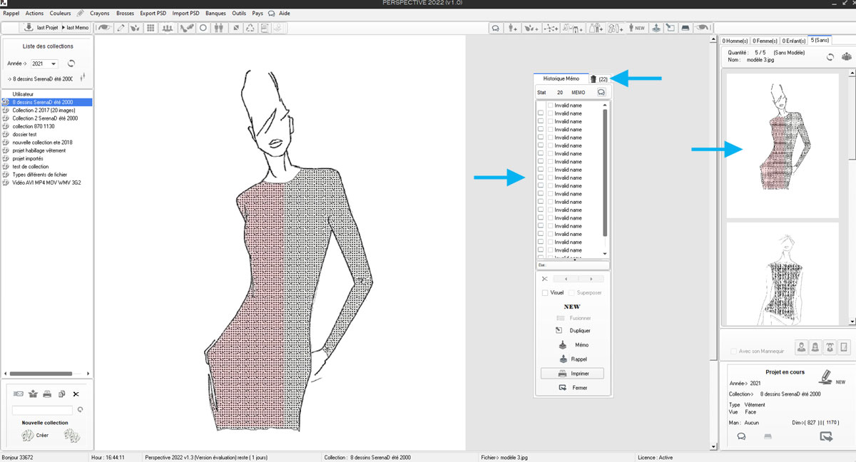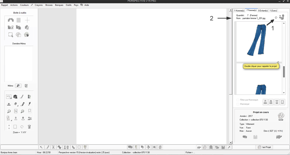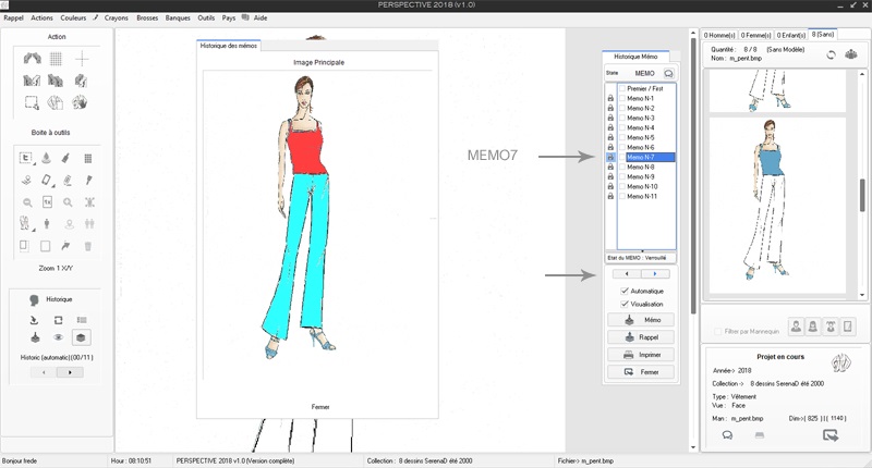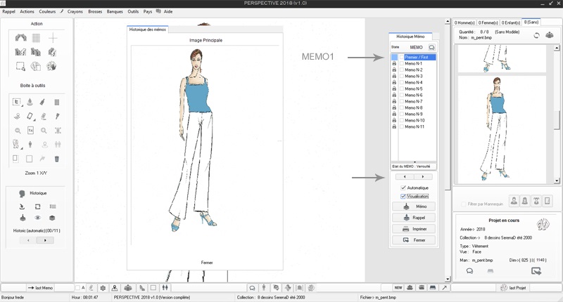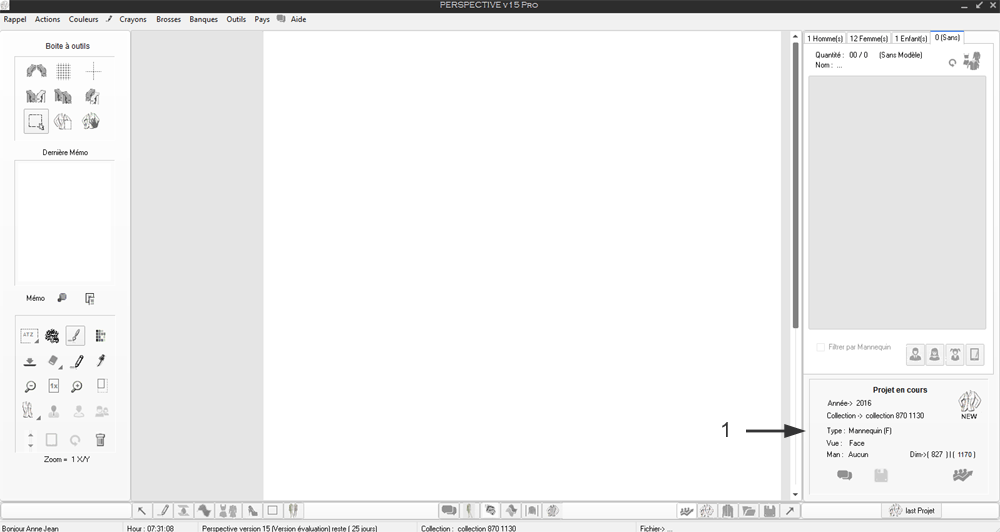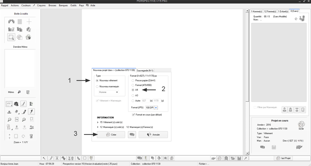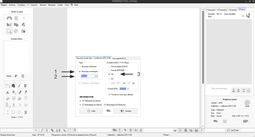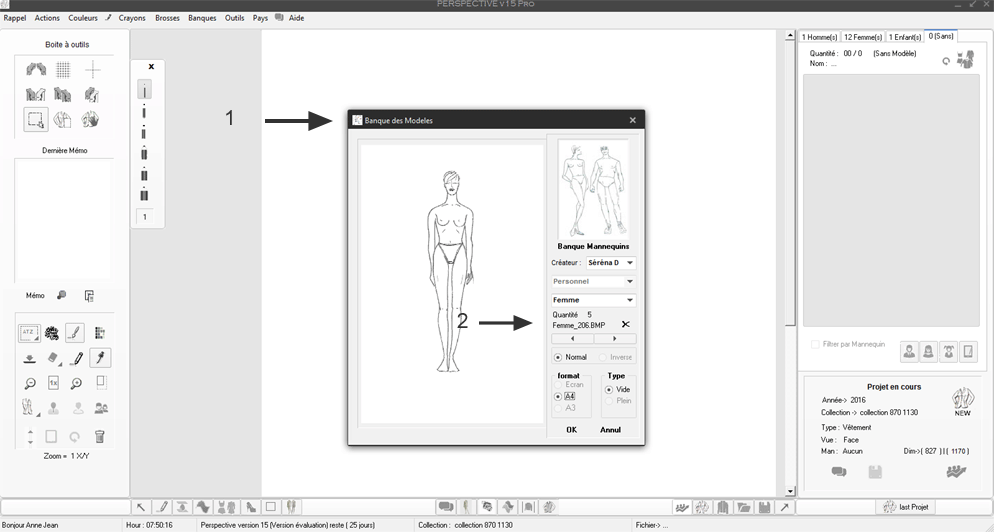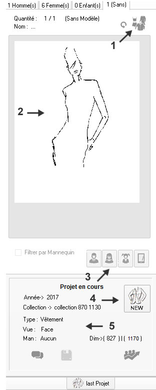 Note : En 1 il est précisé le type de projet en cours ici un mannequin de type F (Femme)
