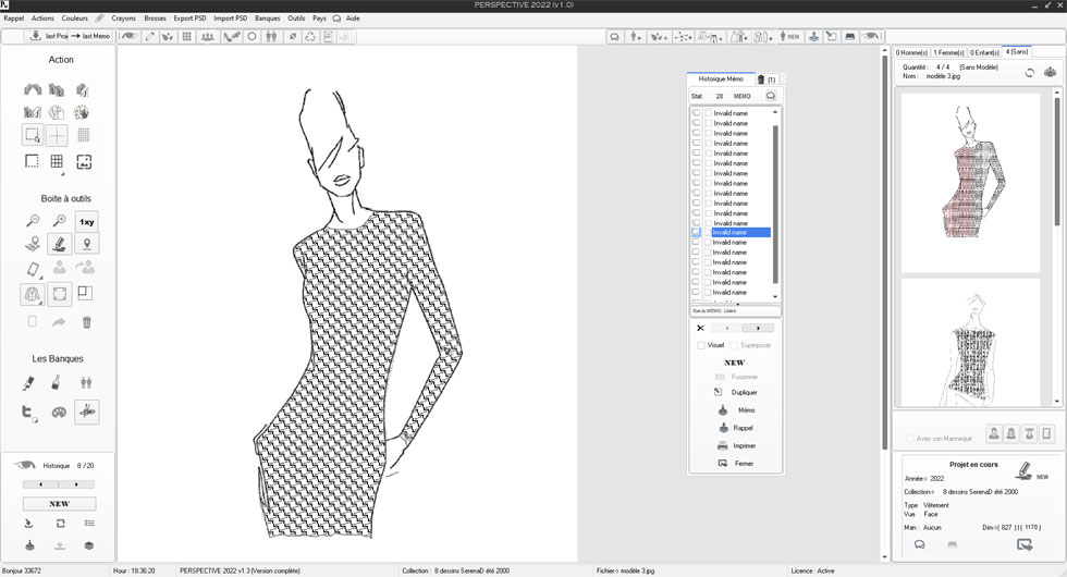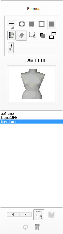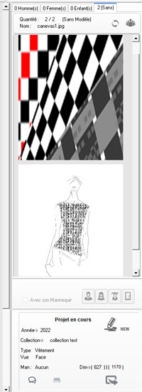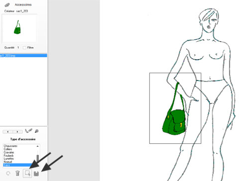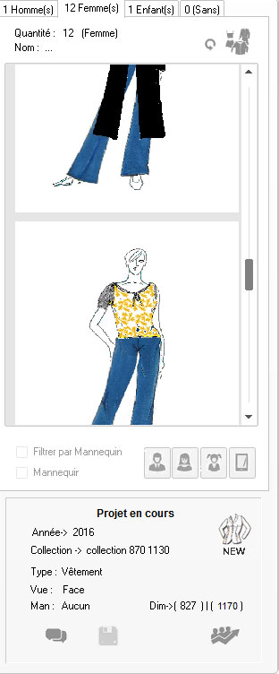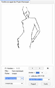 sélectionné. Sur la partie basse se trouvent les fonction de sélection du dessin (sur son mannequin) ou l’accessoire a été dessiné.