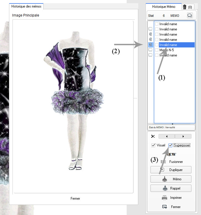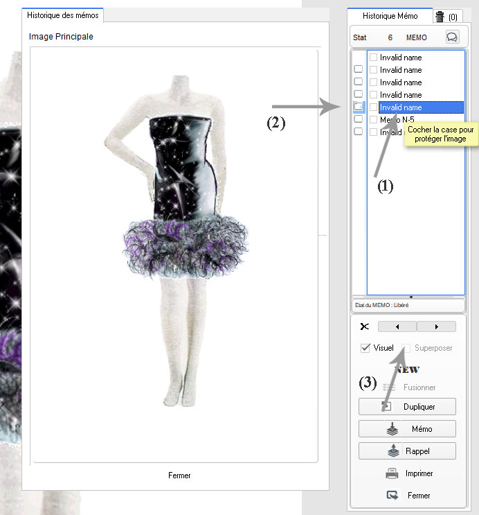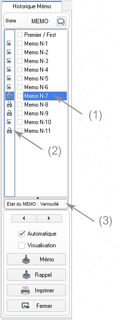 Détail : - En (1) sélection de chaque mémo pour un rappel ou une visualisation - En (2) Etat du mémo en cours (calque sur photoshop) - (3) indicateur de l'état du mémo en cours, un clique sur l'icone pour le Verrouiller ou le Libérer. Fonctions