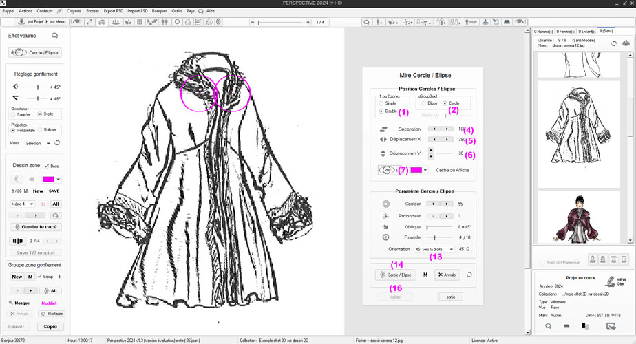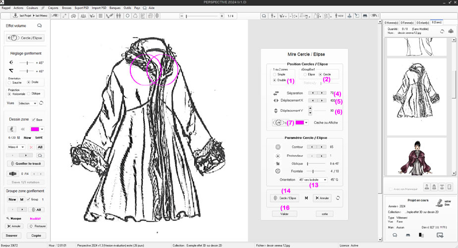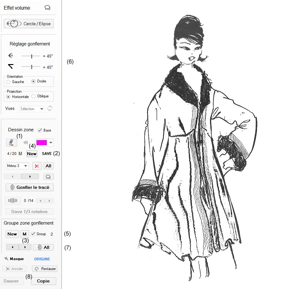 le tracé suivant (corps de la robe). 5) En 5 nous voyons que nous avons mémorisé 2 tracés dans le Groupe. 6) Avant de lancer le gonflement des 2 tracés mémorisés, on règle les paramètres d'angle de projection et d'oblique et le sens de projection (gauche ou droite). 7) en cliquant sur (ALL) PERSPECTIVE gonfle l'un après l'autre les tracés mémorisés dans le groupe pour obtenir ce dessin final à 45° vers le droite (visage et corps de la veste).. 8) a ce stade nous pouvons modifier les règlages et recommencer à appliquer un nouveaugonflement (ALL) Note : si nous procédons à un gonflement (sur 1 zone) seulement, inutile de cliquer sur le bouton (ALL) un clique sur (Gonfler le tracé) suffit . L'utilation de (M) puis de