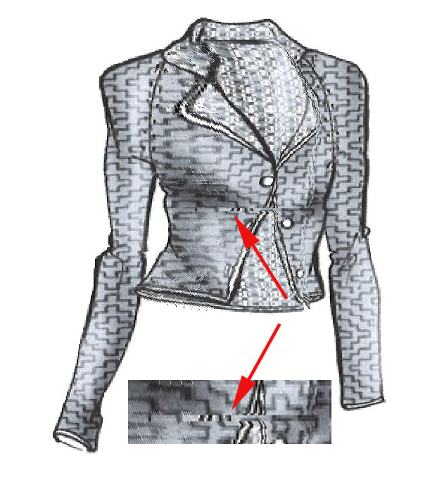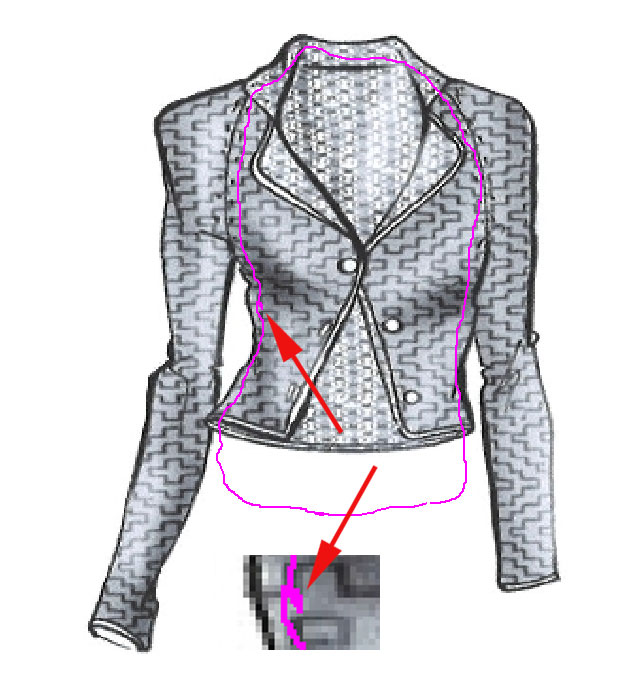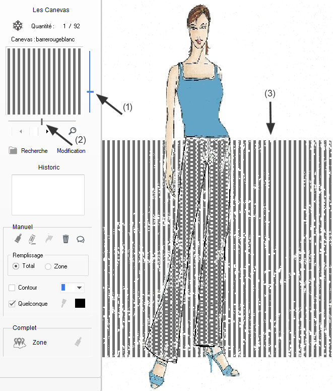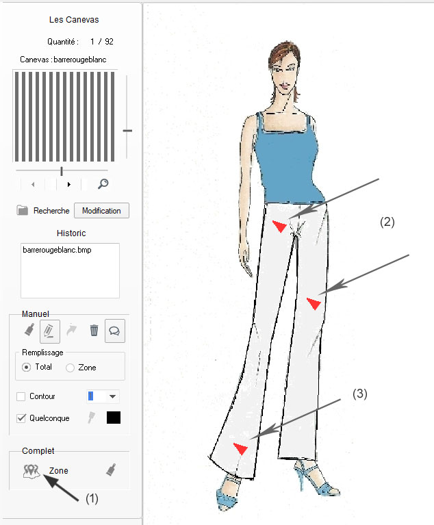 de modifier directement la position du canevas par rapport au dessin. - En (3) on peut appercevoir le canevas par transparence qui doit être utilisé pour charger le pentalon. Détail : Note