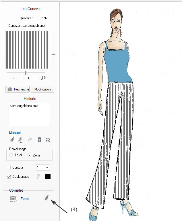 chargement final A présent nous allons effectuer le transfert final du canevas sélectionné et positionné selon nos besoins. En (1) sélection de l'outil Zone qui n'est autre qu'un pinceau de remplissage des Zone qui seront ensuite chargées du canevas précédemment sélectionné et positionné. En