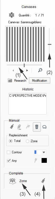Note : si le contour de la zone à charger est interrompue on peut toujours la combler avec un crayonnage ou en utilisant le tracé de ligne pour fermer la zone concernée. En (4) on clique sur le pinceau pour lance le chargement complet du canevas dans les zones remplit en (gris clair) couleur sélectionnée automatiquement par Perspective pour cette fonction. Important : les zones à charger doivent être d'une couleur unique quelque soit la couleur (blanc, , les zones sélectionnées par le remplissage de couleur (gris clair) doivent être uniformes (voir ci-dessus)