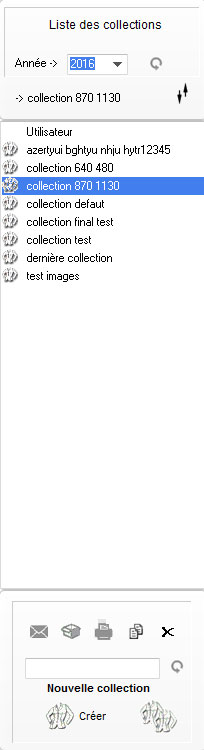 l’année en cours. Sur la partie basse se trouve le formulaire de création des collections (30 caractères maxi par nom de la collection). Note : la ligne nommée Utilisateur n’est pas une collection proprement parlé, elle correspond à un espace neutre. |