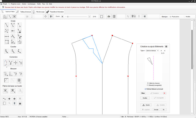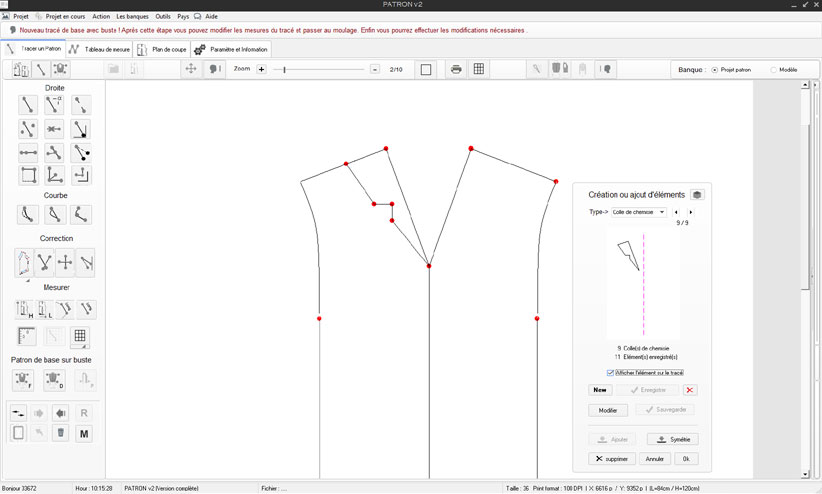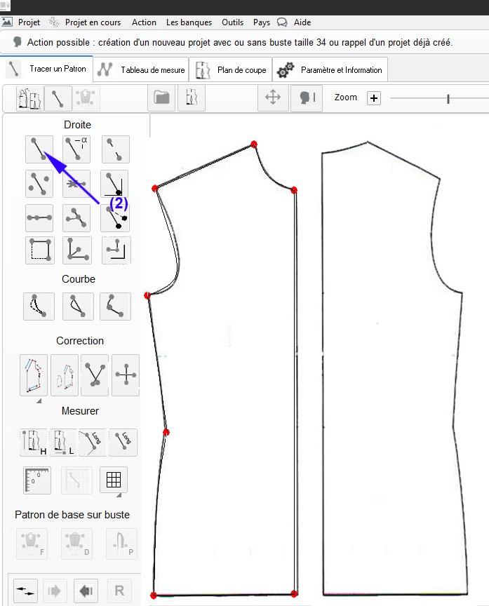 1) En dessinant le patron avec les outils de traçage (droite et courbe) aux dimensions réelles par le biais de l’outil zoom et des 2 fonctions de traçage de droite permettant la création du tracé global.