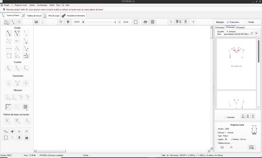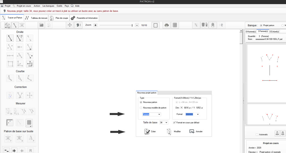 Un clique sur New, la sélection de la taille du projet : ici taille 34 on clique sur Créer pour entrer dans le nouveau projet.