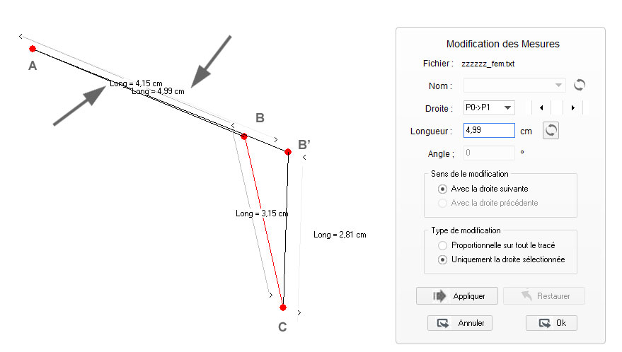 Note : une deuxième méthode consiste à redimensionner non pas l'ensemble du tracé mais droite par droite, méthode plus longue et moins précise mais qui peut être utilisée pour modifier une ou plusieurs