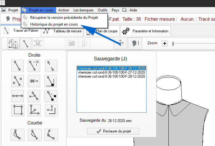 Sélectionner ou créer un classeur dans lequel sera mémorisé le ou les patrons du même vêtement ici un dossier nommé (Projet patron v2 exemple).