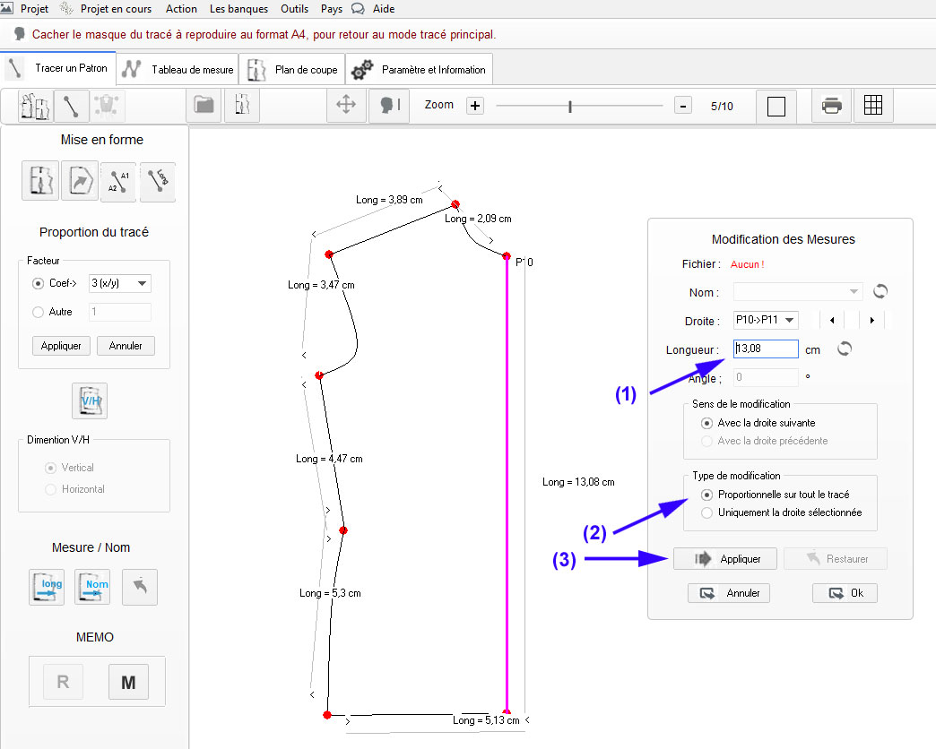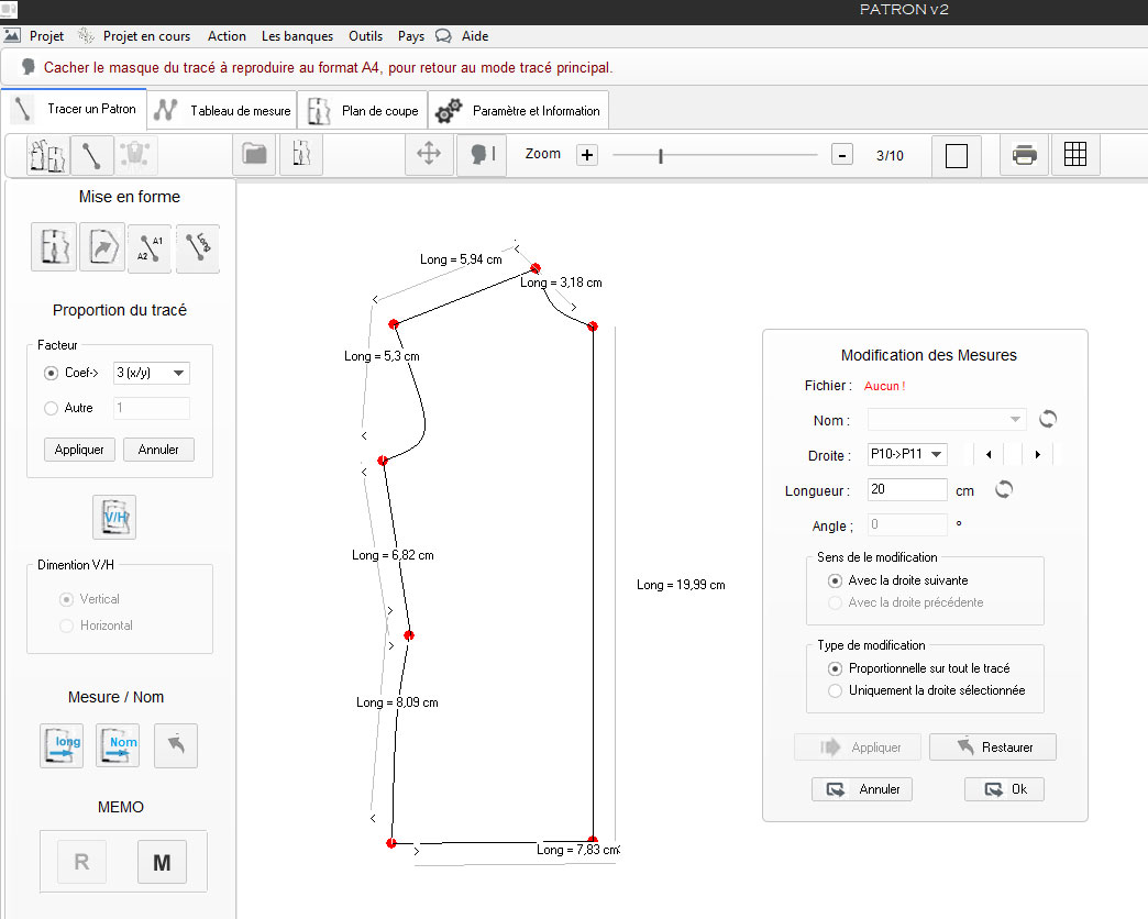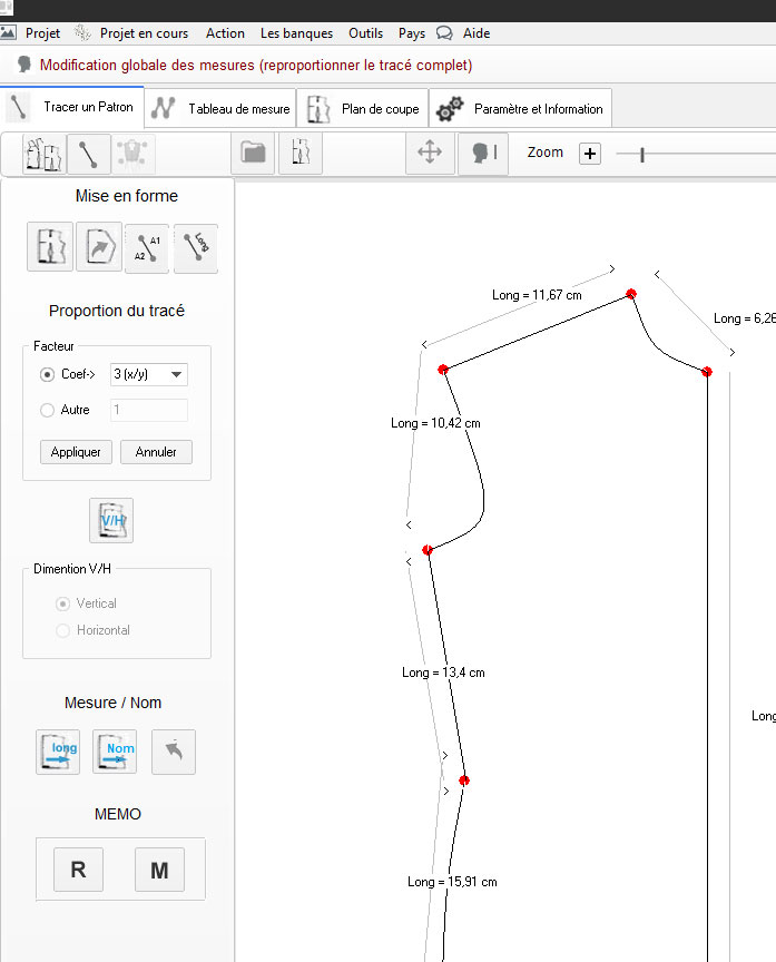 Méthode 2 : On peut redimensionner l’ensemble du dessin en modifiant la mesure d’une droite en lui rendant sa vraie mesure et le radio calculé par PATRON sera appliqué sur toutes les autre mesures du tracé