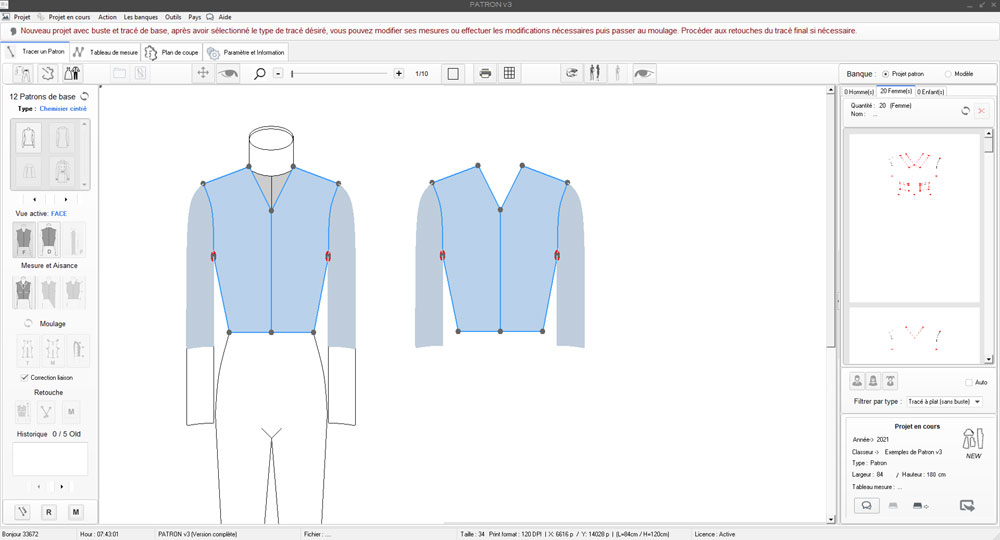 Exemple : si le projet en cours est de taille 34, les mesures appliquées au buste et aux 12 tracés de bases seront en conformité avec les mesures du tableau de mesures de la taille sélectionnée.
