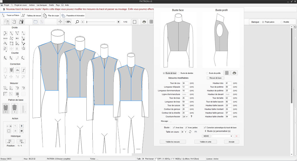 1) Sélectionner un buste, il aura les mesures de la taille du projet en cours (automatique), sachant que les mesures du buste seront en correspondance avec les mesures du trableau de mesures associé à la taille du projet en cours.