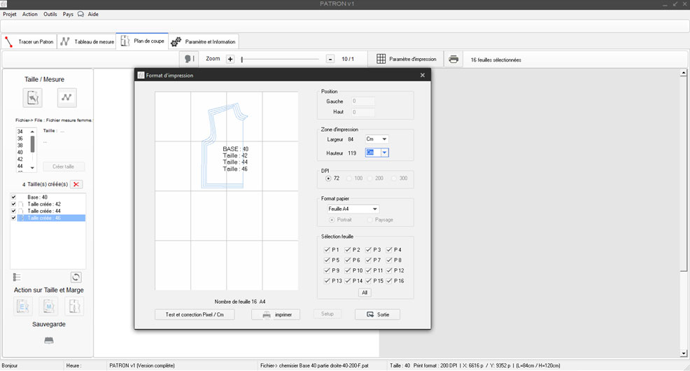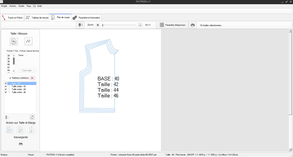 Résultat obenu après sélection de la taille 40 avec une marge de couture de 1 cm et désélection des feuilles inutiles.