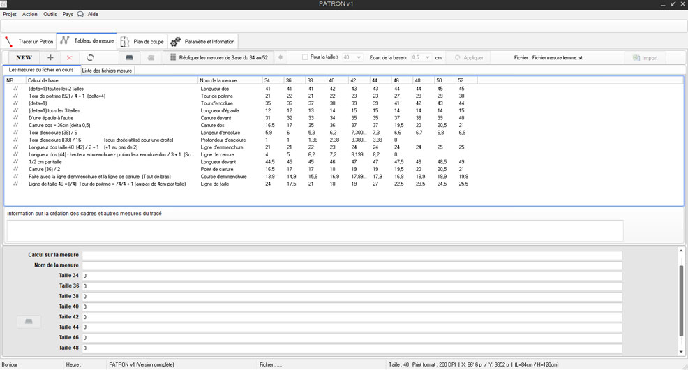 permettent l'importent selon la taille de base du patron, toutes les mesures du tracé après que chaque droites ou courbes aient été nommés (sélection d’un nom de mesure dans une liste pour chaque droite ou courbe).