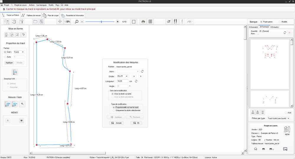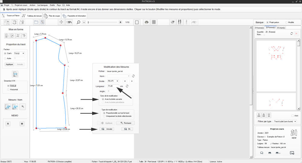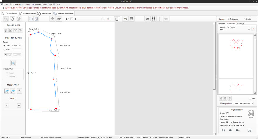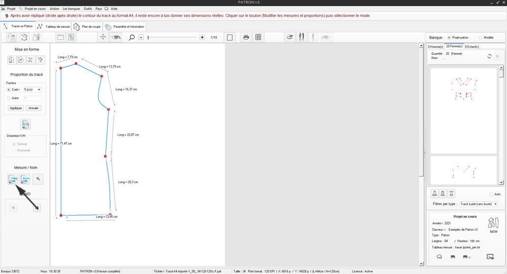1) Cliquer sur l'Icone 'Long' sélectionner la plus grande mesure du tracé ici longueur dos = 14,29 cm, et fonction de sa dimension souhaitée soit 71,47 cm, Patron appliquera le même Rtio sur tout le dessin.