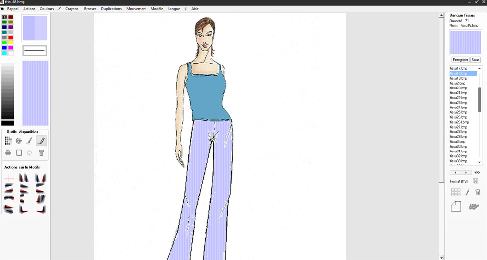 Volet Tissus: Le volet Tissus, permet d'accéder à la banque des canevas créés avec l'outil CRE_CAN destiné à cet effet. Ce panneau donne accès à certaines fonctions comme le remplissage par cryonnage ou par remplicage.