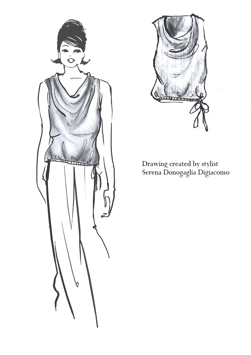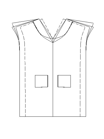 Si dessous l’exemple d’un tracé de base type chemisier créé automatiquement selon les mesures du buste personnel, on y a ajouté une colle issue de la banque des éléments précédemment créé et mémorisé.