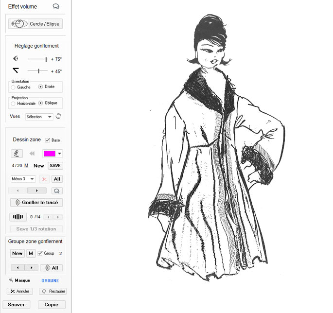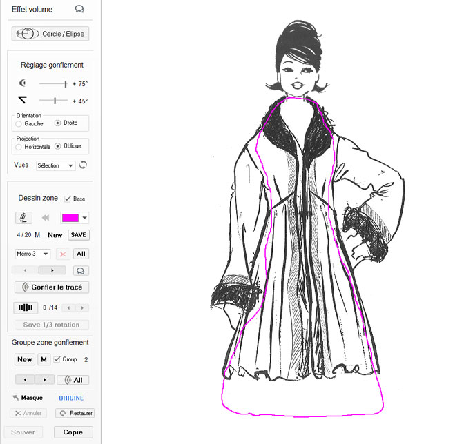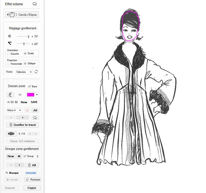 Note : Après avoir sélectionné les 2 zones à gonfler (Visage et partie de Veste), nous avons 2 possibilités. pour effectuer l'Effet 3D sur le dessin.